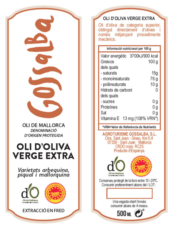 Extra Virgin Olive Oil, Denomination of Origin Oil of Mallorca.